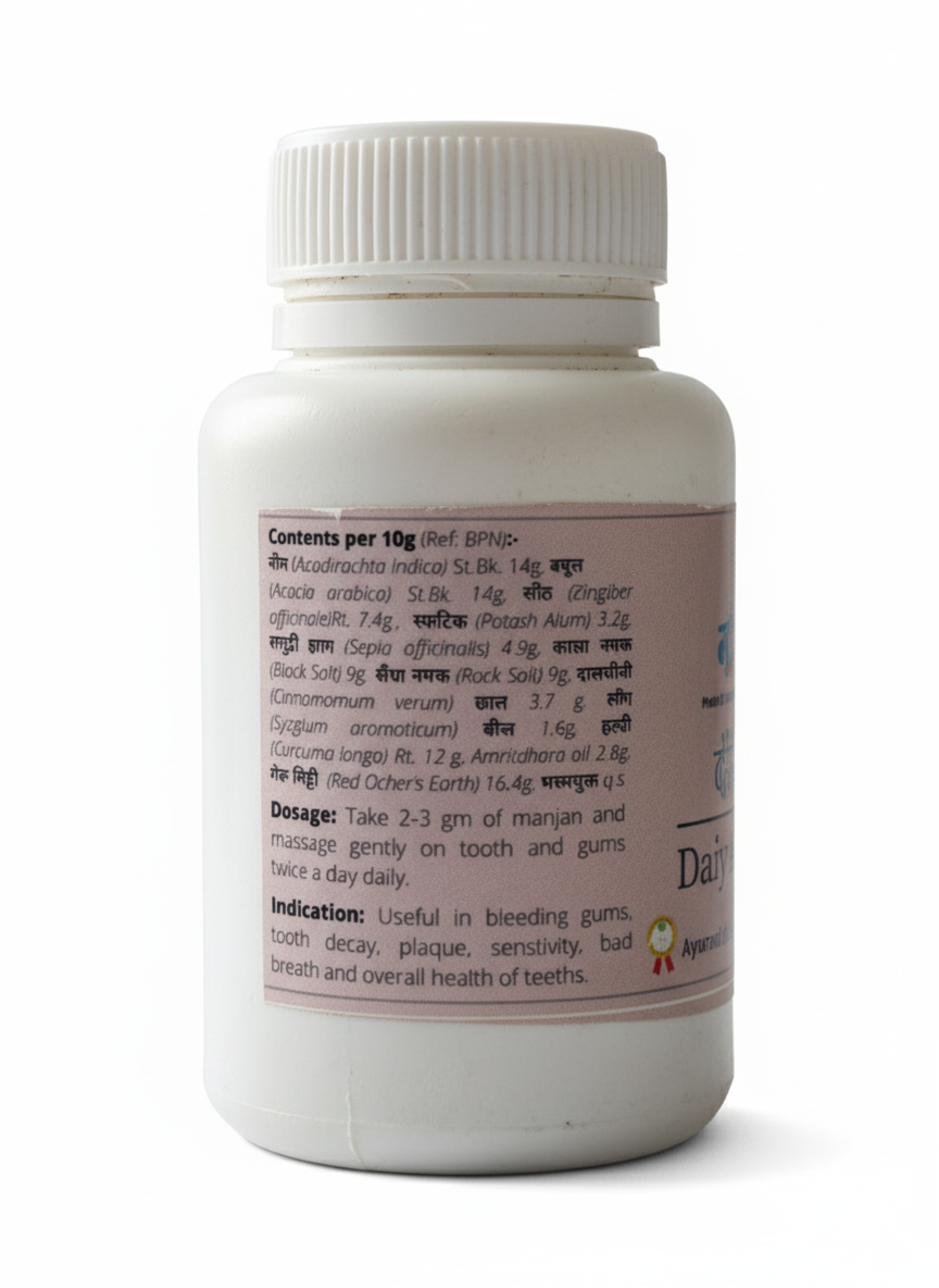 Prakriti Dantsuraksha is made from good quality herbs like long, dalchini, pudina, camphor, saindha namak, kala namak, neem, babul, saunth and sphatic bhasm, powered with Bhasm.